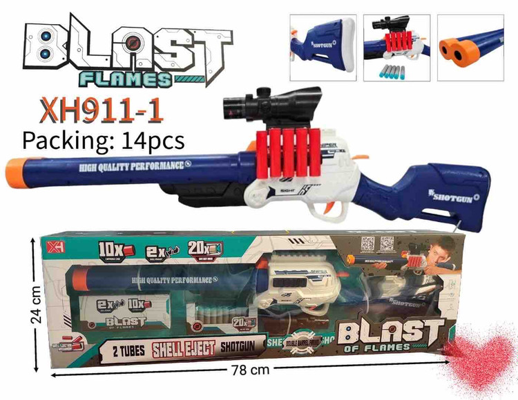 تفنگ اسباب بازی پوکه پران دو لول تير ابري XH911 یک اسباببازی بینظیر است که با ایده گرفتن از تفنگهای شکاری طراحی شده است. این تفنگ دو لوله دارد که داخل هر کدام از آنها یک تیر ابری سبک قرار میگیرد. با هر بار فشاردادن ماشه، یکی از این تیرها شلیک شده و پوکه آن هم روی زمین میفتد. این تفنگ یک دوربین پلاستیکی مشکی رنگ هم دارد که روی تفنگ نصب میشود. بچهها با نگاهکردن از داخل آن میتوانند دقیقتر نشانهگیری کنند.