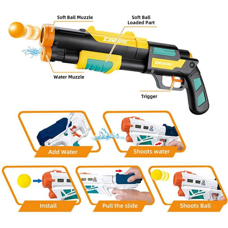 یکی از سرگرمی ها و بازی های تابستان، آب بازی است و تفنگ آب پاش این بازی را سرگرم کننده تر می کند. تفنگ دو کاره توپ ابری و آبپاش بولینگ دار یکی از بزرگترین و پر قدرت ترین تفنگ های دو کاره است که هم توپ پرتاب می کند و هم آب می پاشد. این تفنگ که شمایلی به سبک تپانچه دارد به شکل خود تپانچه، به وسیله ی اهرم زیر لوله تفنگ مسلح می شود.